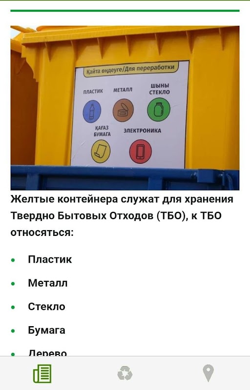 Приложение “Tabighat” имеет множество очень полезных функций которые отлично подойдут людям которые начали свой экологически правильный путь. “Tabighat” позволяет найти пункты приема по переработке и утилизации бытовых и производственных отходов. “Tabighat” позволяет вам оценить расстояние, ознакомиться с ценами на вторсырье, а также узнать стоимость утилизации мусора в Астане. С “Tabighat” сортировка мусора и экономия ресурсов станут для вас понятным и обыденным делом.
