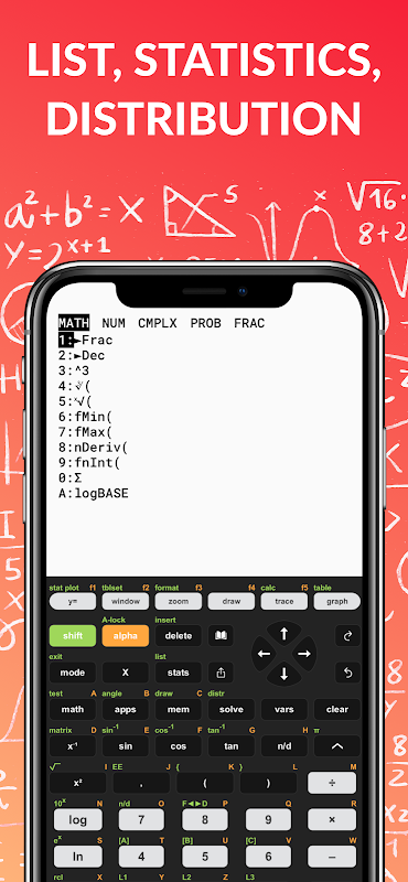 • حساب التوزيعات المختلفة: Normalpdf / cdf، invT، Tpdf / cdf، خي2pdf / cdf، Fpdf / cdf، Poissonpdf / cdf 84، Binompdf / cdf، Geometpdf / cdf.