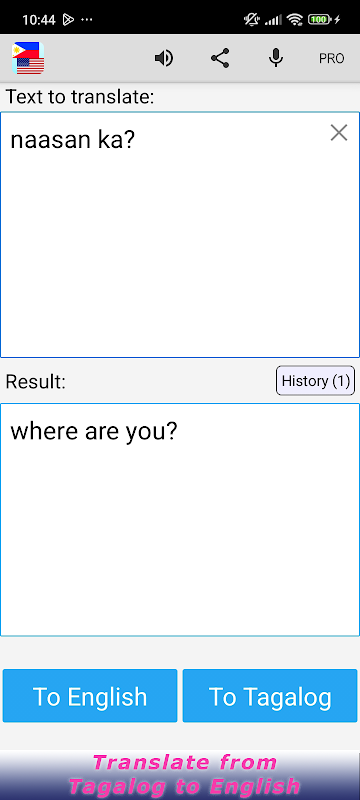 هذا التطبيق المجاني قادر على ترجمة الكلمات والنصوص من اللغة الإنجليزية (أو العربية) إلى التاجالوجية، ومن التاجالوجية إلى الإنجليزية.