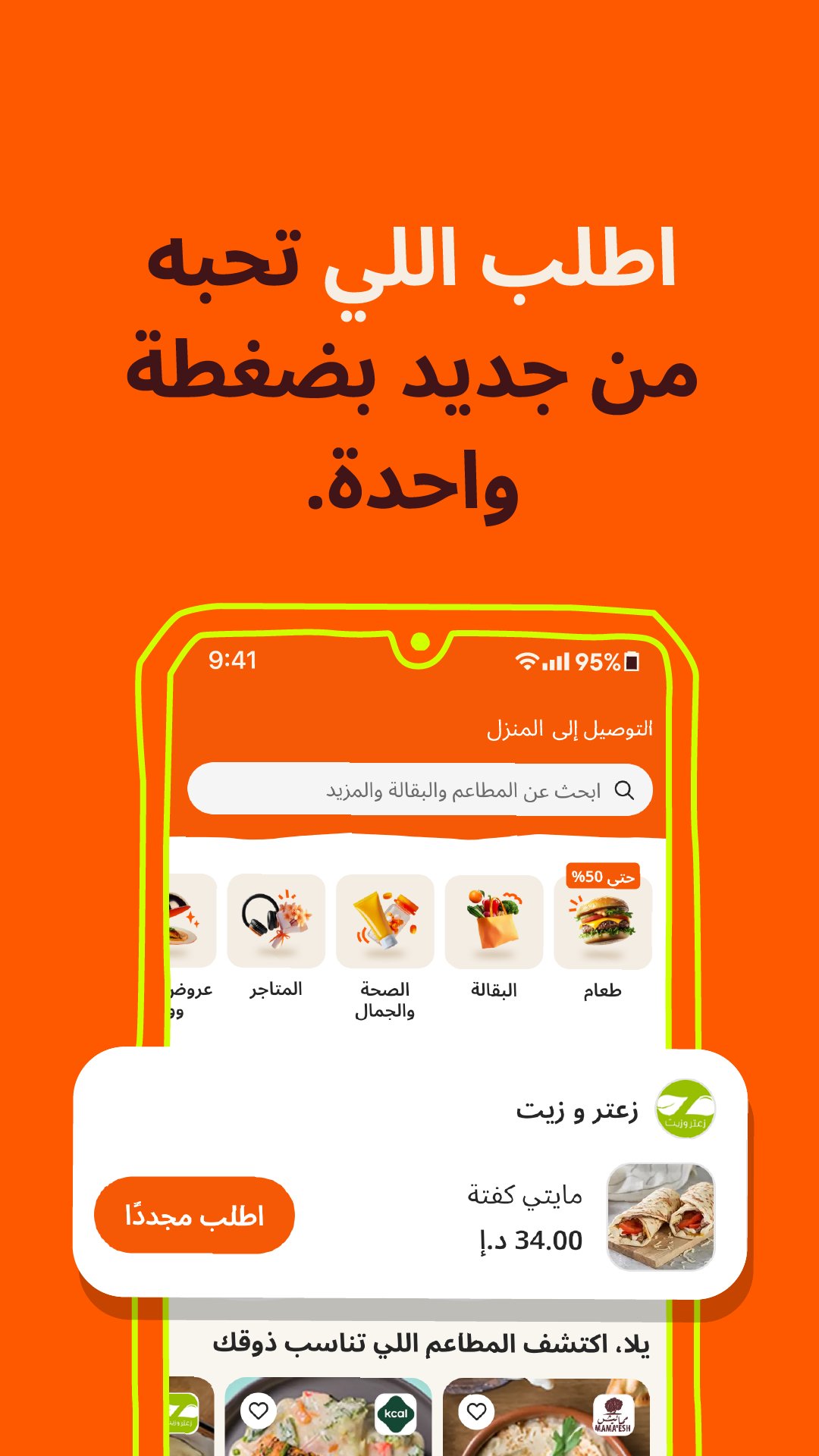 كل اللي نفسك فيه موجود على طلبات في أي وقت! الأكل اللي تحبه، طلبات البيت، توصيل موثوق من طلبات مارت، وأشياء أخرى رائعة مثل الزهور، ومستلزمات الحيوانات الأليفة، والصيدليات، وغيرهم الكثير. وكمان جددنا شكل التطبيق!