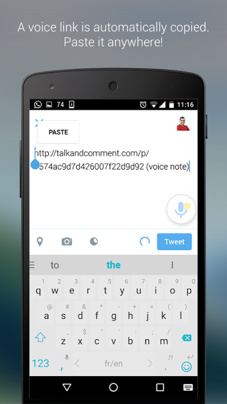 Talk & Comment lets you make and send voice notes in any app (Twitter, Facebook comments and groups, Email, YouTube, Reddit, Google+, Slack, ...) or your favourite news site.