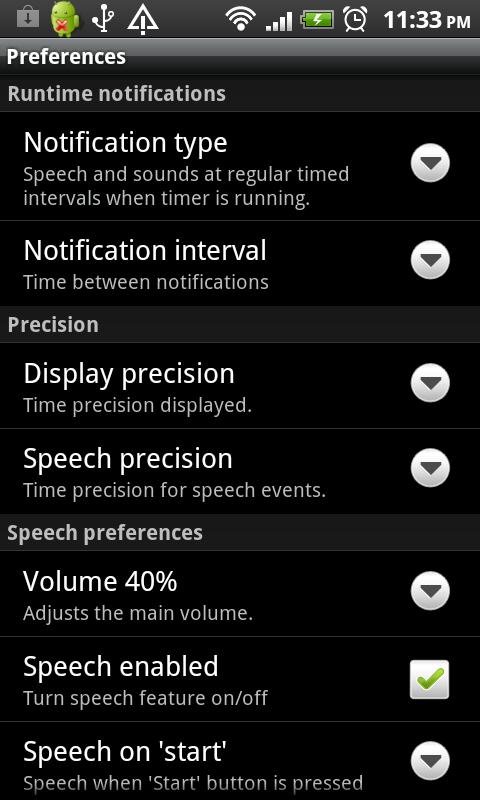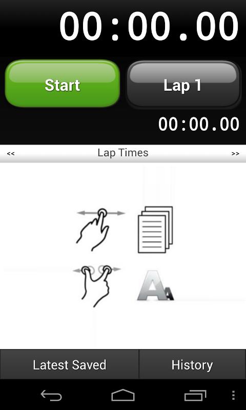 Lap timer operates precisely to 1/1000 second via on-touch actions (not on-press). Nearly all other stopwatches and lap timers on the Android market operate on press... these timers are not as accurate as Talking Stopwatch since a press can take up to 1/3 second and yet a touch is instantaneous.