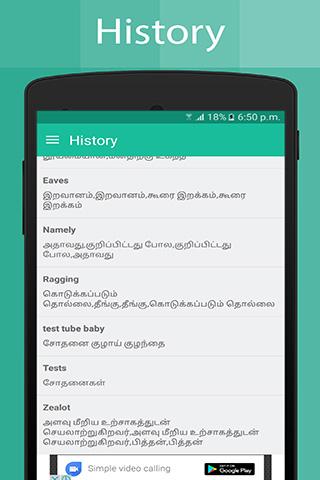 يحتوي قاموس التاميل على العديد من الكلمات ، فهو يساعد على تحسين المفردات ويسهل على المتعلمين الجدد الذين يرغبون في تعلم التاميل. سيساعدك معجم من الإنجليزية إلى التاميل أيضًا في تذوقك بمعرفة التاميل من خلال اللعب في الاختبار ، ويمكنك الحصول على إجادة أكثر من لغة التاميل. يعطي هذا القاموس نتائج أسرع وهو مشاحنات تمامًا حرية الوصول. فقط اكتب كلمة إنجليزية في شريط البحث وستحصل على معنى وترجمة هذه الكلمة في الثانية.