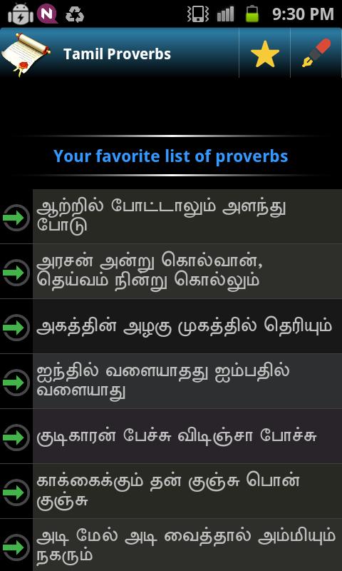 الأمثال التاميل تطبيق الروبوت بسيط يحتوي على الأمثال التاميل تستخدم عادة يعرف شعبيا باسم عبارات قصيرة من الحكمة الشعبية. الحكمة هي في شكل ملاحظة عامة حول العالم أو قليلا من المشورة، وأحيانا أكثر ما يقرب من الموقف تجاه هذا الوضع.