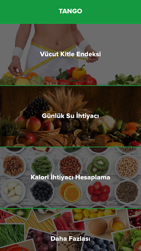 Tango uygulamasıyla vücut kitle endeksinizi hesaplayabilir. Fazla kilolarınızı kontrol edebilirsiniz. Ayrıca Tango uygulaması size günlük su ihtiyacınızı ve ortalama günlük kalori ihtiyacınızı hesaplama imkanı verir.