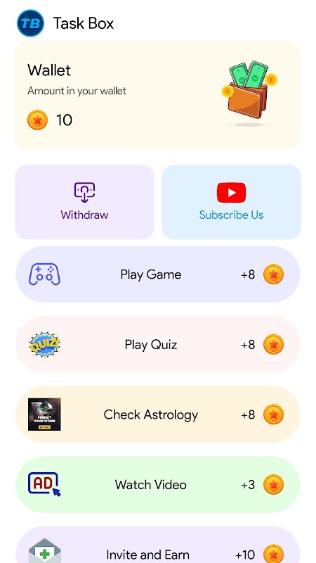 Task Box هو تطبيق ألعاب ترفيهي حيث يمكن للمستخدمين ممارسة الألعاب والإجابة على الاختبارات واستكشاف علم التنجيم. من خلال المشاركة في هذه الأنشطة، يكسب المستخدمون العملات المعدنية.