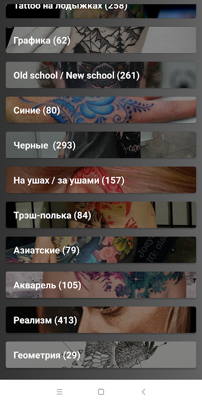В нашем приложение собрано множество категорий в которых вы точно найдете подходящую для вас татуировку. Категории разбиты по расположению тату, по стилю исполнения и по цвету.