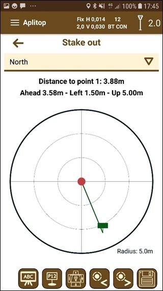 Points to be staked out are imported from a text file, and they can be selected on the map or filtered by code. The user can switch interactively among several modes:
