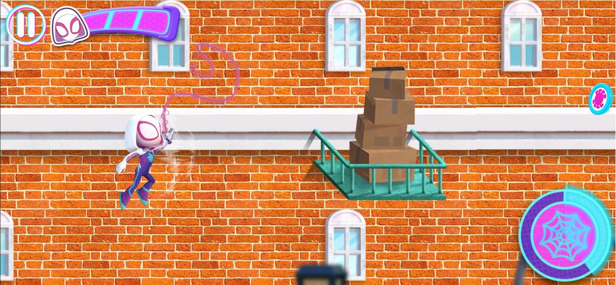 حان وقت التأرجح! لإرشاد سبايدي وأصدقائه. انقر على الشاشة للقفز فوق العوائق، أو اقفز قفزة أعلى بالنقر مرتين. بالنقر على الزر، يمكنك تدمير الأجسام المقتربة أو لمّ شمل فريقك.