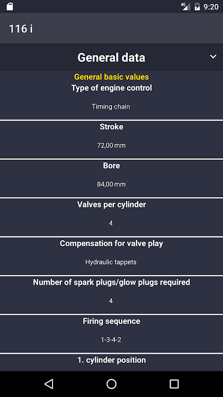 البيانات مقسمة إلى فئات: معلومات عامة ، شاسيه ، عزم دوران شد البراغي والصواميل ، نظام الوقود ، نظام الفرامل ، مصابيح الإضاءة ، فترات الاستبدال وأحجام السوائل التقنية.
