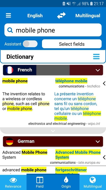 يمنحك TechDico إمكانية الوصول إلى أهم مصادر الترجمة المتاحة: IATE (المصطلحات الأوروبية) ، Eur-Lex-Europa.eu (نصوص القانون الأوروبي) ، WIPO / b> (براءات الاختراع الدولية) و CJKI (مسارد اللغات الآسيوية) والقواميس المتخصصة متعددة اللغات.