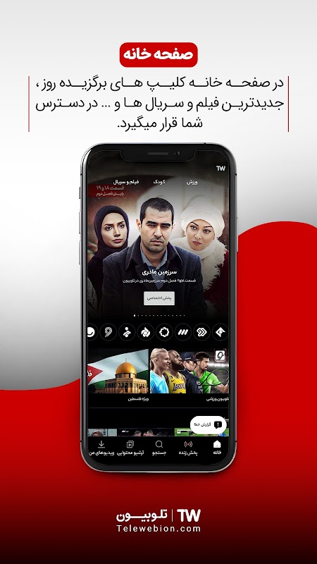 مع Telewebion ، يمكنك الوصول إلى البث المباشر لـ 60 قناة تلفزيونية. يمكنك مشاهدتها مباشرة أو تنزيلها ومشاهدتها لاحقًا.