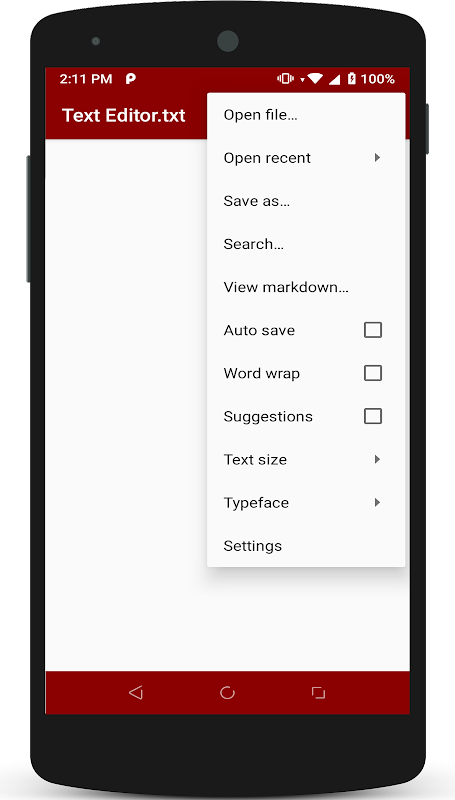 يمكنك إنشاء ملف نصي جديد ، والعمل مع الملفات الموجودة (تحديد ، نسخ ، قص ، لصق) ، حفظ الملفات على بطاقة SD.