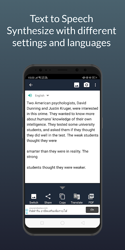 Text Reader: OCR Text Scanner هو تطبيق للتعرف على الشخصيات من صورة بدقة عالية ودقة عالية (99٪). يتحول هاتفك المحمول إلى ماسح ضوئي ومترجم.