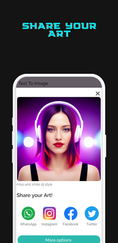 باستخدام Text To Image ، لديك الحرية في اختيار الطريقة التي تريد أن يظهر بها فنك. يمكنك عمل رسومات باستخدام الذكاء الاصطناعي تشبه الرسوم الهزلية أو الرسوم المتحركة أو الصور الحقيقية ، حسب حالتك المزاجية وتفضيلاتك. يساعدك Text To Image على القيام بذلك من خلال تقديم مجموعة متنوعة من أنماط الفن للاختيار من بينها. سواء كنت ترغب في إنشاء رسوم هزلية مرحة وملونة ، أو رسم كاريكاتوري لطيف ومفصل ، أو صورة واقعية ومذهلة ، يمكن أن يساعدك Text To Image على تحقيق رؤيتك الفنية في ثوانٍ.