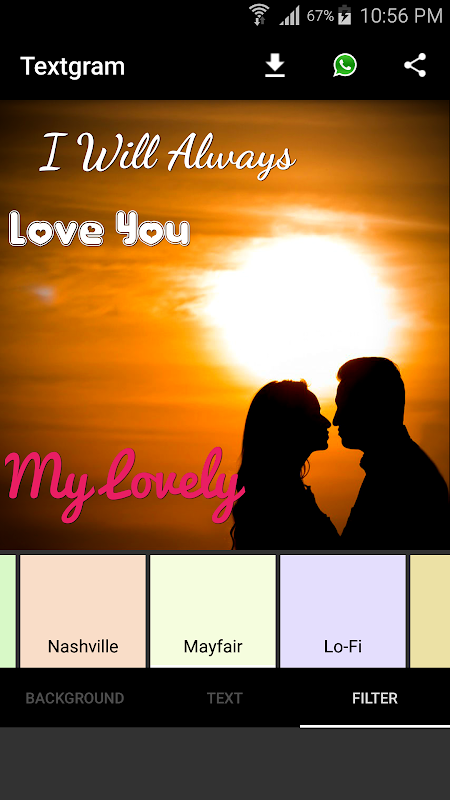 In the menu FILTER Textgram - Text on Photos, you can filter your text that you created with beautiful filter. Very easy to use, only click on the filter that you want and you can see the applied filter instantly.
