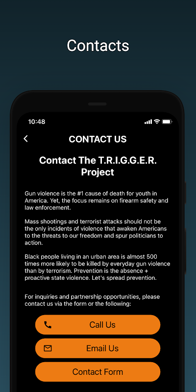 مئات من جرائم القتل تؤثر على المديرين المبدعين لهذا المشروع. وبشكل أعمق، يعد التعرض للعنف المسلح أمرًا روتينيًا محزنًا للأطفال داخل المجتمعات الملونة المحرومة في المدن الكبرى مثل واشنطن العاصمة وسانت لويس وميسوري وميلووكي ويسكونسن وبالتيمور بولاية ماريلاند. يتمتع فريقنا بتاريخ من حب الشباب ويتولى مسؤولية مصيرهم. نظرًا للحاجة إلى نهج مبتكر وشخصي لإنهاء العنف المسلح، فإن T.R.I.G.G.E.R. يبرز المشروع صوت ووجهة نظر الأشخاص القريبين من كل عمل من أعمال العنف. T. R. I.G.G.E. المشروع، المستوحى من قصص حقيقية، يمنح الجمهور نظرة داخلية للعديد من الأرواح التي تتصارع مع العنف المسلح يوميًا من خلال وصف الألم والشدائد التي لا تُقاس والتي تؤدي إلى استخدام العنف المسلح. الألم العميق يتطلب الشفاء العميق. فالشفاء لا يمكن أن يبدأ إلا بالاعتراف الحقيقي بالأسباب.