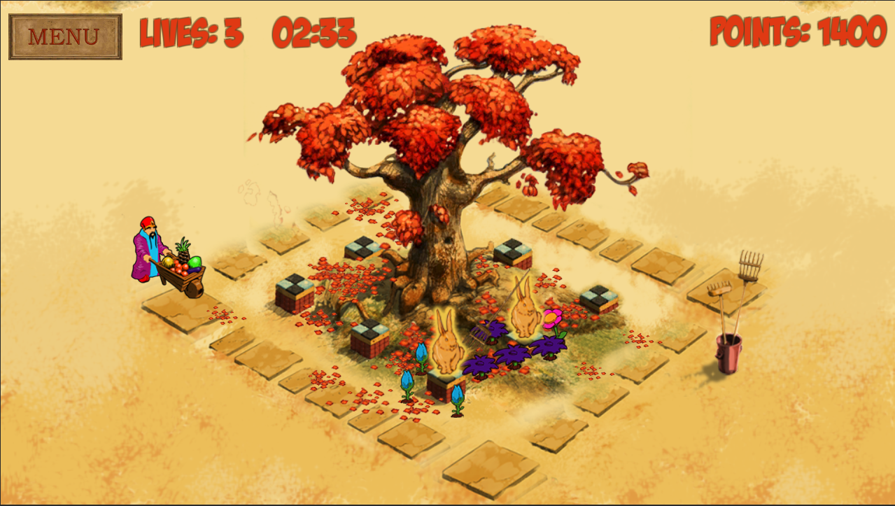 Leaves fall when the wind blows, and the player must use the magic rake to clear the paths for the fruit sellers that come by.