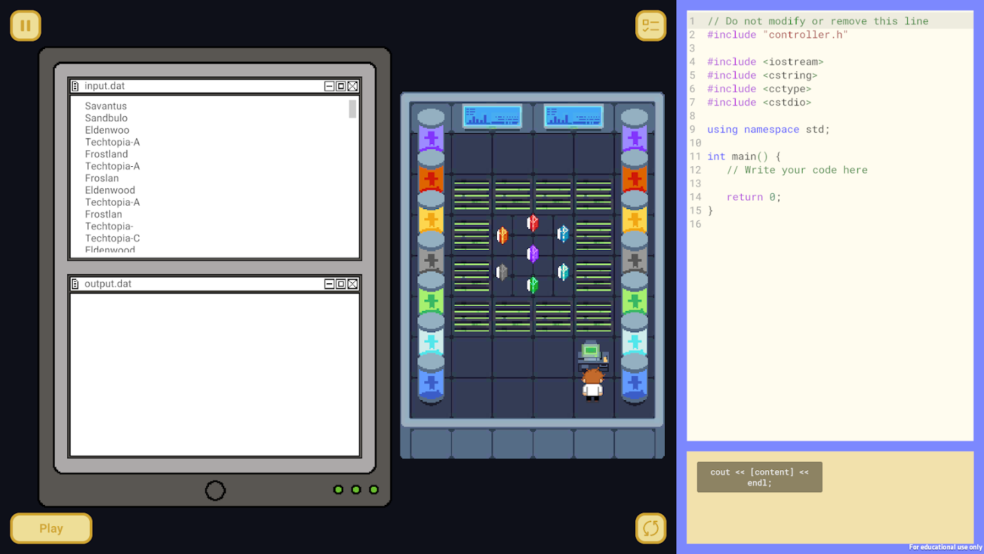 - متقدم: الوضع الأكثر تحديًا، حيث يجب على اللاعبين المطلعين على بنية C++ كتابة بناء جملة C++ بأنفسهم في محرر التعليمات البرمجية لتوجيه الشخصية ومسح المستويات. تتم إزالة ميزة السحب والإفلات وكتل الترميز المحددة مسبقًا.