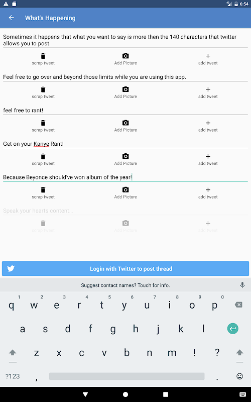 Luckily, with the Thread Tweets app you can just write your story as quick as you can type it and post the tweets in one go. Saving you the time you would’ve lost from waiting for each tweet to post. Thanks to how the UI is setup. One can also add visual media to create a more intriguing story.
