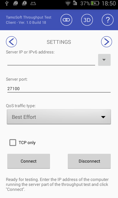 وتثبيت جزء ملقم على الجانب سلكي من الشبكة، ومن ثم استخدام هذا الجزء العميل تشغيل على جهاز الروبوت الخاص بك لقياس الأداء. أدخل عناوين IPv4 أو عنوان IPv6 لخادم ثم انقر فوق اتصال. سيقوم العميل محاولة الاتصال بالخادم، وإذا كان الاتصال ناجحا، واختبار مستمر الإنتاجية تبدأ. انتقد الرسم البياني لرؤية TCP و UDP الإنتاجية، وفقدان UDP، والوقت ذهابا وإيابا. الوثائق كامل متاح هنا .