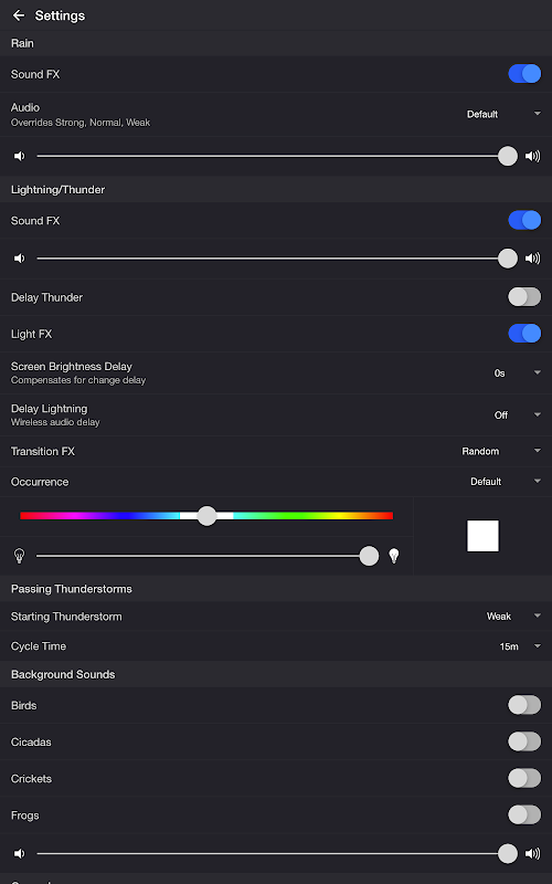 تحويل الشاشة إلى اللون الأسود — إضافة طبقة سوداء وضبط سطوع الجهاز على الحد الأدنى. استخدم إعداد تأخير سطوع الشاشة لتعويض زيادة السطوع في بعض الأجهزة. اضبطه على 0.25-1 ثانية إذا لم تصل تأثيرات البرق إلى ذروة السطوع عند أعلى مستوى للرعد. • البرق عند الطلب — ابدأ عاصفة رعدية واستخدم أزرار البرق أسفل الشاشة للتحكم اليدوي.