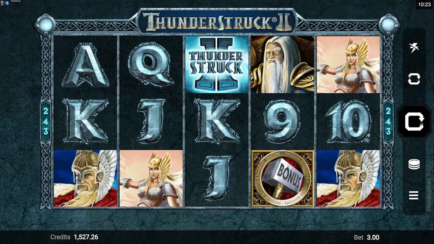 Ascend to the realm of Asgard in search of the mythical top prize worth more than 121,000 coins in 243-way video slot, Thunderstruck II. Wilds, random wilds and a selection of bonus modes await. Play for free with bets ranging from 0.30 to 15 coins per spin. Thunderstruck II offers maximum win on a single bet over 121,000 coins, 5 reels and 243 bet ways. If you’re a fan of innovative bonus modes, you’ll love Thunderstruck II and its multiple bonus rounds. Match three or more hammer scatters, and you’ll be given a choice of up to four bonus modes, depending on how many times you’ve accomplished this. Each bonus mode has its own unique features and number of free spins. Wilds can substitute for any regular symbol, and random wilds also occur. Match three or more Wilds to win up to 50 coins, or three or more Thors to win up to 25 coins.