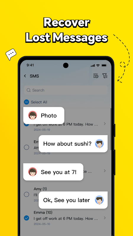 ◉ استعادة جهات الاتصال والرسائل: يمكنك استرداد جهات الاتصال والرسائل النصية المهمة بسهولة، بما في ذلك تفاصيل الاتصال الكاملة وتاريخ المحادثات الكامل. لا تفقد اتصالات قيمة مرة أخرى.