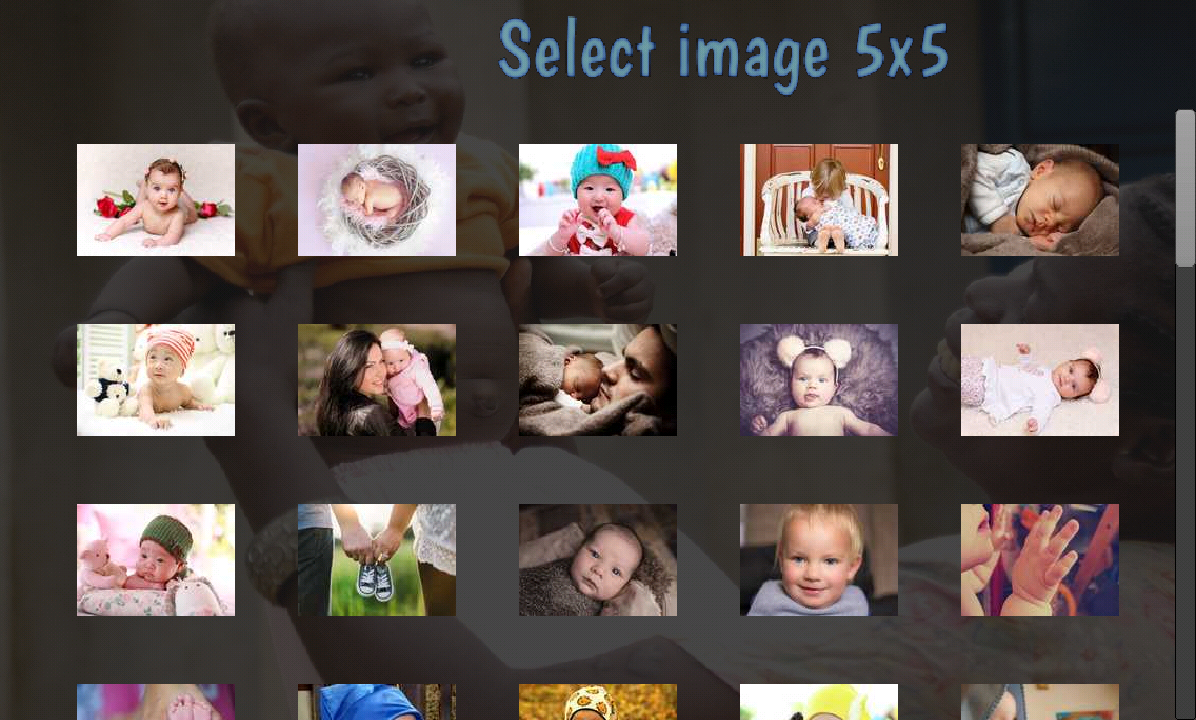 Solve this babies tile puzzle by dragging and dropping the image tiles. You can choose between different puzzle sizes and there are lots of baby images with different difficulties available.