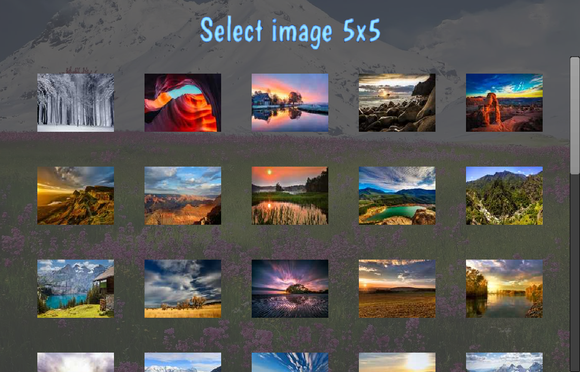 Solve this landscapes tile puzzle by dragging and dropping the image tiles. You can choose between different puzzle sizes and there are lots of landscapes images with different difficulties available.