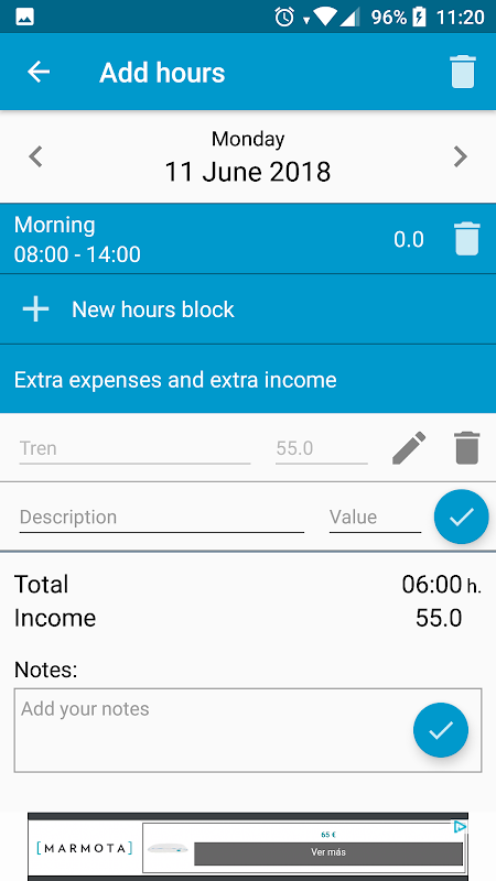 • إضافة وتعديل الساعات التي كنت قد قضيت كل يوم. يمكنك أيضا استخدام ساعة والسعر أنواع مختلفة، وبالتالي حساب كسب المال بطريقة بسيطة.