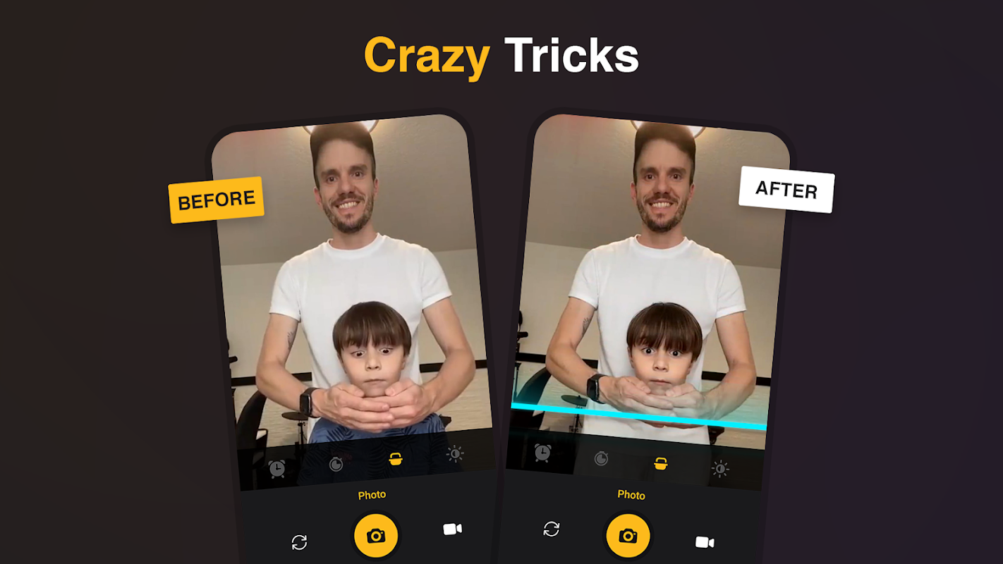 تجربة تأثيرات مسح الوجه مع تحولات الجسم. قم بتحريك أو تمديد أو لف جسمك للحصول على نتائج مضحكة ومسلية