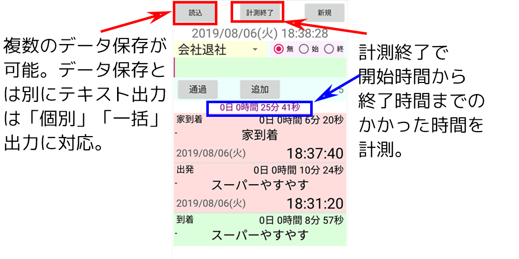 المحتوى عبارة عن تطبيق يشبه بطاقة الوقت يقيس الوقت المستغرق بين نقطتين أو أكثر. يمكن أيضا أن تكون البيانات المسجلة الإخراج كنص!