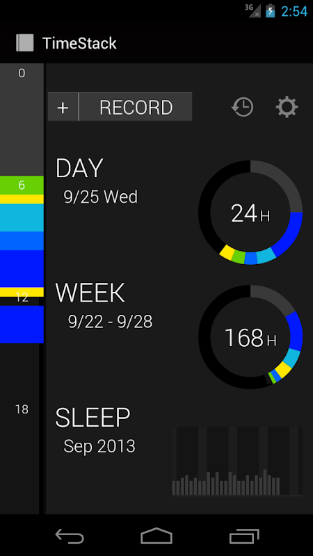 There are pie chart and bar chat for statistics, and there is a history view that list each day, week and month.
