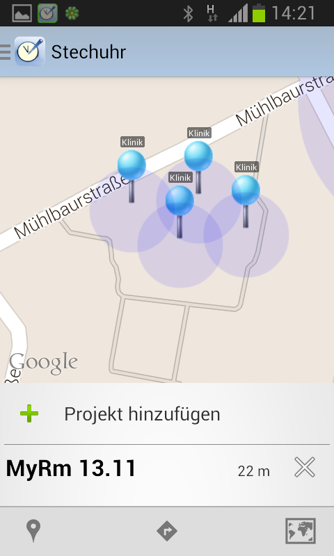 Die App repräsentiert eine einfach gehaltene, automatische mobile Stechuhr. Wen man auf der Landkarte beliebige Plätze markiert und mit einem Projekt verknüpft hat, registriert die App anhand Ihrer Location für welches Projekt oder Kunden Sie tätig sind.