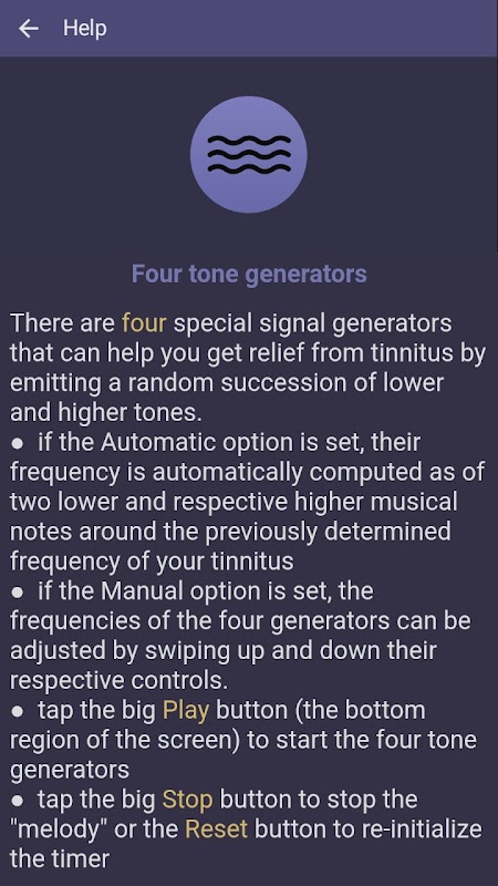 - إذا تم ضبط الخيار تلقائي، فسيتم حساب ترددها تلقائيًا على أساس نغمتين موسيقيتين أقل وأعلى على التوالي حول التردد المحدد مسبقًا لطنين الأذن لديك