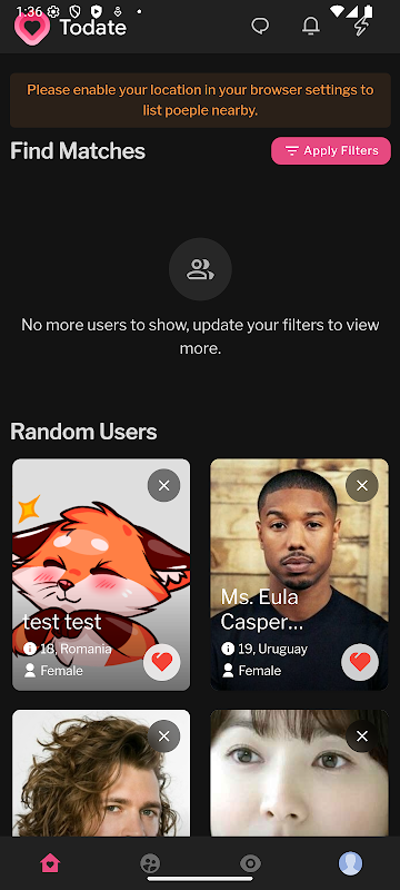 ToDate تطبيق تواصل اجتماعي حديث مخصص للتواصل الحقيقي. أنشئ ملفًا شخصيًا، واكتشف أشخاصًا بالقرب منك، وابدأ محادثات شيقة. سواء كنت ترغب في علاقة جادة أو مجرد مقابلة أشخاص جدد، يوفر لك ToDate مساحة آمنة وودية.
