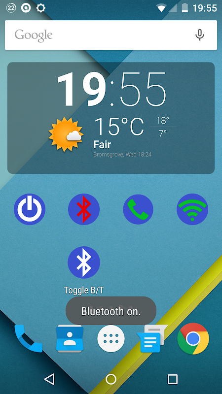 Put the widget on your home screen and tap it to toggle your Bluetooth setting. The widget indicates the current Bluetooth setting by the colour of the Bluetooth icon as follows: