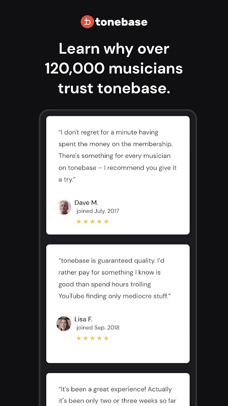 لمدة 5 سنوات ، كانت Tonebase هي الأكاديمية والمجتمع رقم 1 على الإنترنت للموسيقيين الكلاسيكيين. ينتقل أعضاؤنا الذين يزيد عددهم عن 100000 بمهاراتهم إلى المستوى التالي كل يوم من خلال تعليمات الخبراء وأدوات التعلم الحديثة.