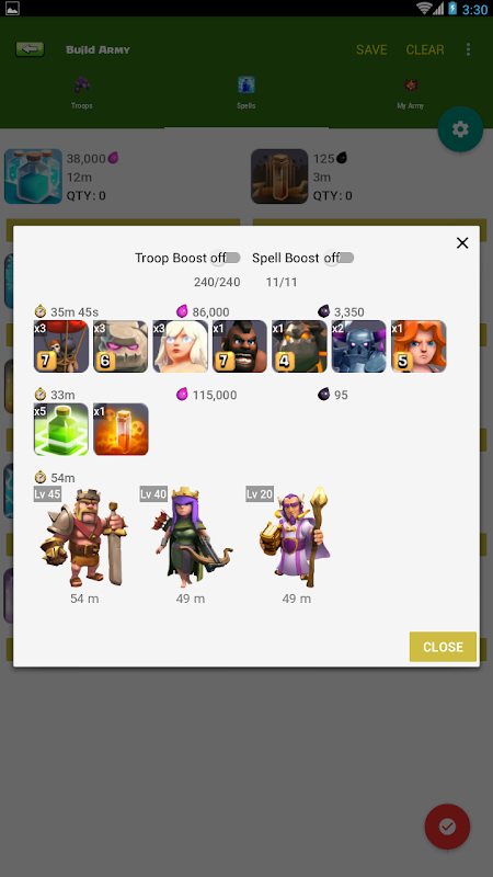 Toolkit for Clash of Clans is a army calculator and information source for the popular game Clash of Clans. You can build your army complete with spells and heroes.