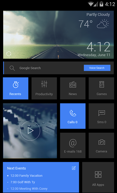Experience nature’s fury right on your homescreen with this functional and powerful theme. Offering a Tile UI design, you have fast access to important device functions like phone, SMS, camera, and email. With a quick glance you can see the time and date, plus the weather conditions wherever you are. There’s even an agenda that tells you where you need to be. On the second page of this theme is a live and active news reader that can be configured to show any news source.