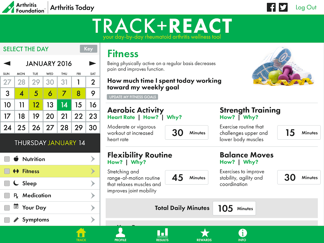 Discover the impact of your daily activities on your arthritis pain with TRACK + REACT. Track your nutrition, fitness, sleep, medication and mood and compare it to your arthritis pain in the Arthritis Impact graph.