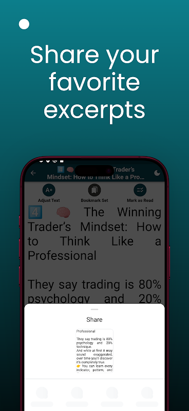📤 مشاركة المقتطفات: أرسل اقتباسات أو رؤى أو تأملات من الكتاب عبر وسائل التواصل الاجتماعي أو تطبيقات المراسلة أو البريد الإلكتروني، أو حتى اطبعها مباشرةً من جهازك.