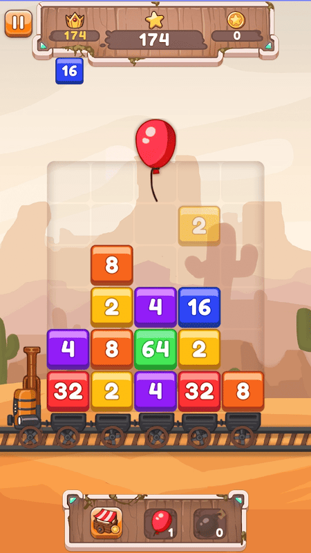 Grab your train ticket and hop onboard of the most fun 2048 games you've ever travelled with. Help the train driver feed the train's engine with coal to rush over the tracks and travel the whole world! In order to do that you have to match fitting number blocks with each other. Each match will provide the engine with some coal. But the train is still not fast enough for your taste? Try to create huge combos using your own skill or the powerful power-ups. Use the balloon to lift numbers blocking your matches, or throw a bomb onto the field to cause a massive explosion. So let's grab control of the train, travel the world and reach the biggest high score!