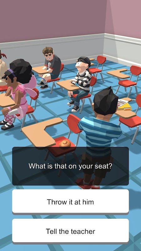 Someone left a poop in your seat and you know who's the culprit behind this. Do you stay calm and turn to the teacher, or do you pick it up and throw it at his face. You might be surprised when the less obvious choice leads to better result! This interactive school life simulator will challenge you and keep you guessing every step of the way!