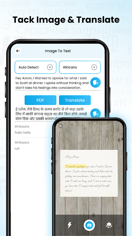 Translate Audio, Image to Text هي أداة رائعة لترجمة النصوص يمكنك من خلالها بسهولة ترجمة النص أو أي جمل أخرى باستخدام طرق مختلفة. يتيح تطبيق Translate Audio, Image to Text للمستخدمين استخدام طرق مختلفة، مثل ترجمة الصوت إلى نص، وترجمة الصورة إلى نص، وترجمة النص. استخدم إحدى الطرق التي اخترتها واعثر على الفور على معنى أي كلمات أو جمل في لغتك باستخدام تطبيق Translate Audio, Image to Text.