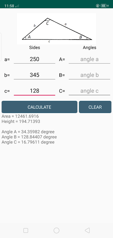 في هذه الآلة الحاسبة ، تحتاج إلى إعطاء 3 مدخلات (ثلاثة جوانب أو جانبان زاوية واحدة أو جانب واحد زاويتان) وستجد المساحة والارتفاع والأضلاع أو الزوايا الأخرى المفقودة.