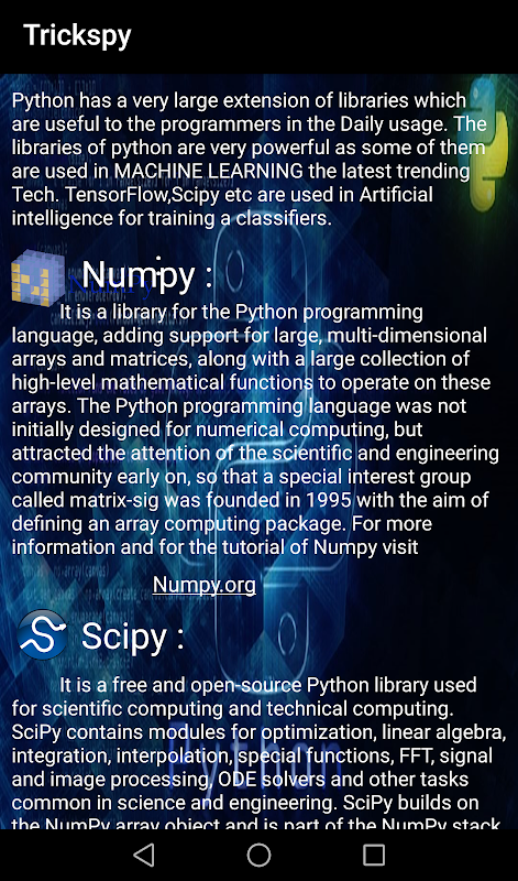 Trickspy is an app which provides a awesome experience of tricks in python which enhances the optimization of code.