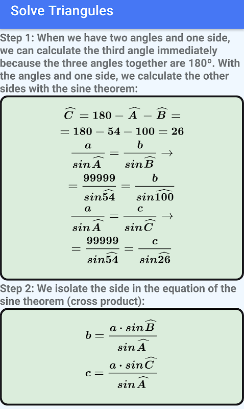 لذلك ، يجب على المستخدم أولاً تقديم ثلاث قيم (يجب أن تكون إحداها جانبًا). سيستخدم التطبيق نظرية جيب التمام ونظرية الجيب (ومجموع الزوايا الثلاث للمثلث 180 درجة) لحساب القيم الثلاث الأخرى.