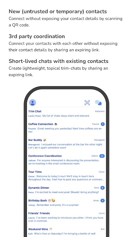 جهات اتصال جديدة (غير موثوق بها أو مؤقتة) - تواصل دون الكشف عن تفاصيل الاتصال الخاصة بك عن طريق مسح رمز الاستجابة السريعة